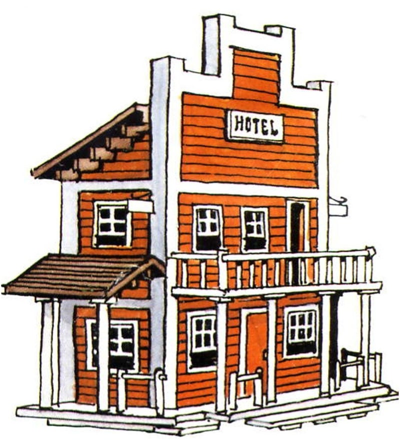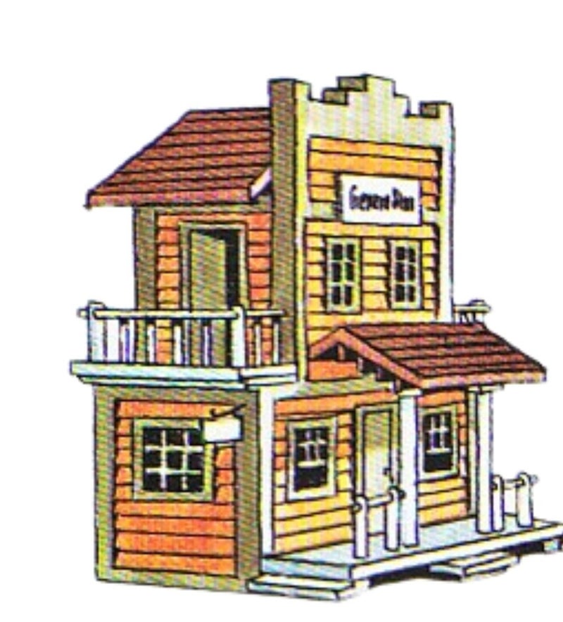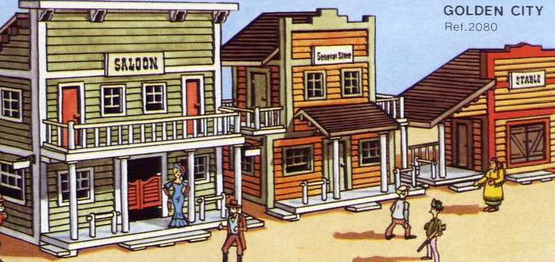 Incluía piezas prefabricadas de aspecto “madera”, establos, caballos, fachadas de edificios del oeste (oficina de sheriff, taberna, hotel, etc.).