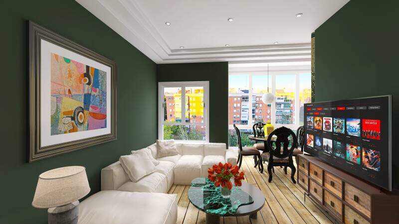 Dato Arquitectónico: Esta zona es el resultado de una ambiciosa reconfiguración. Donde antes se ubicaban la cocina original, la terraza, parte del pasillo, dos dormitorios y parte del baño antiguo, ahora encontramos un espacio diáfano y contemporáneo que respira amplitud.